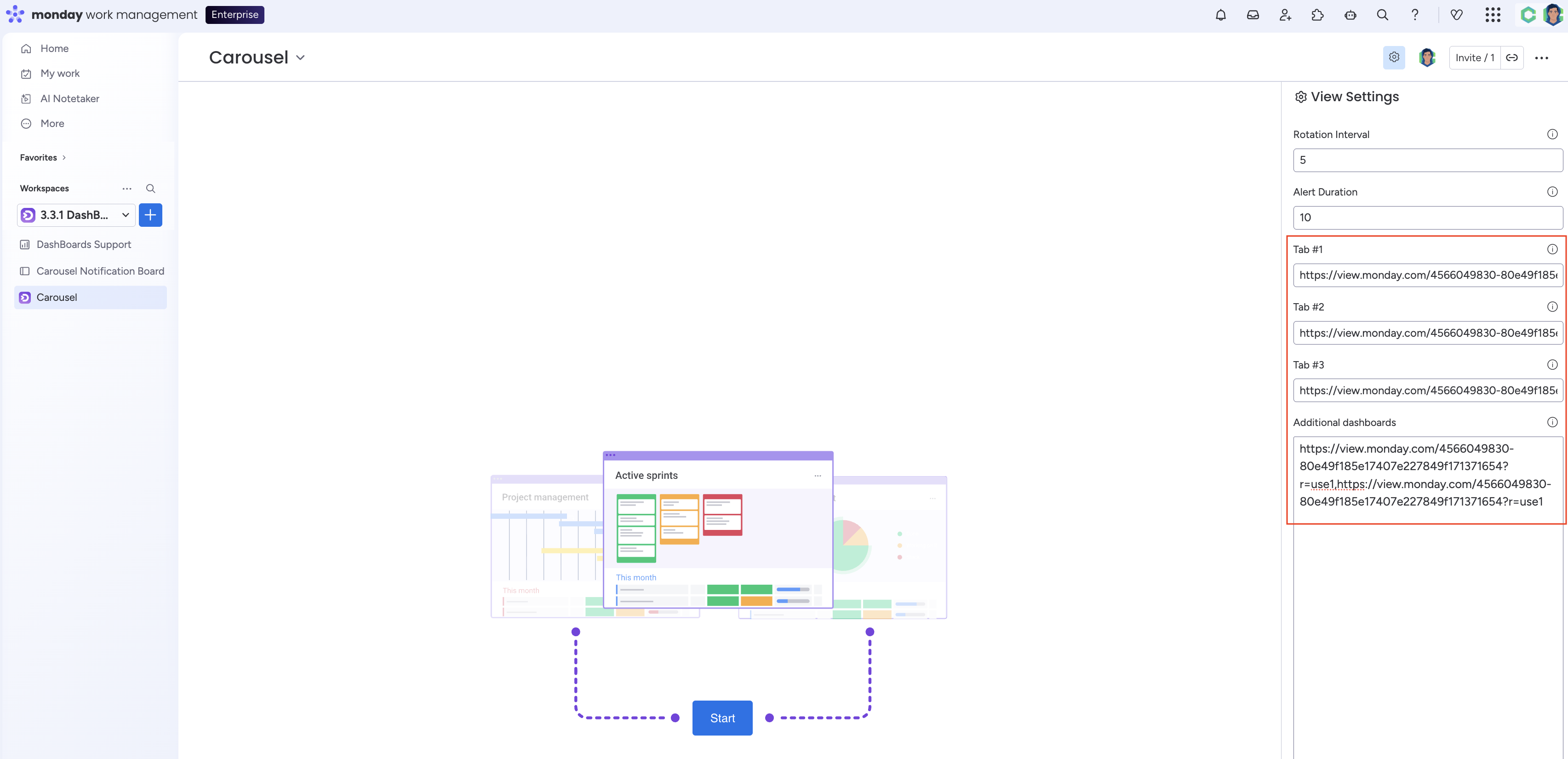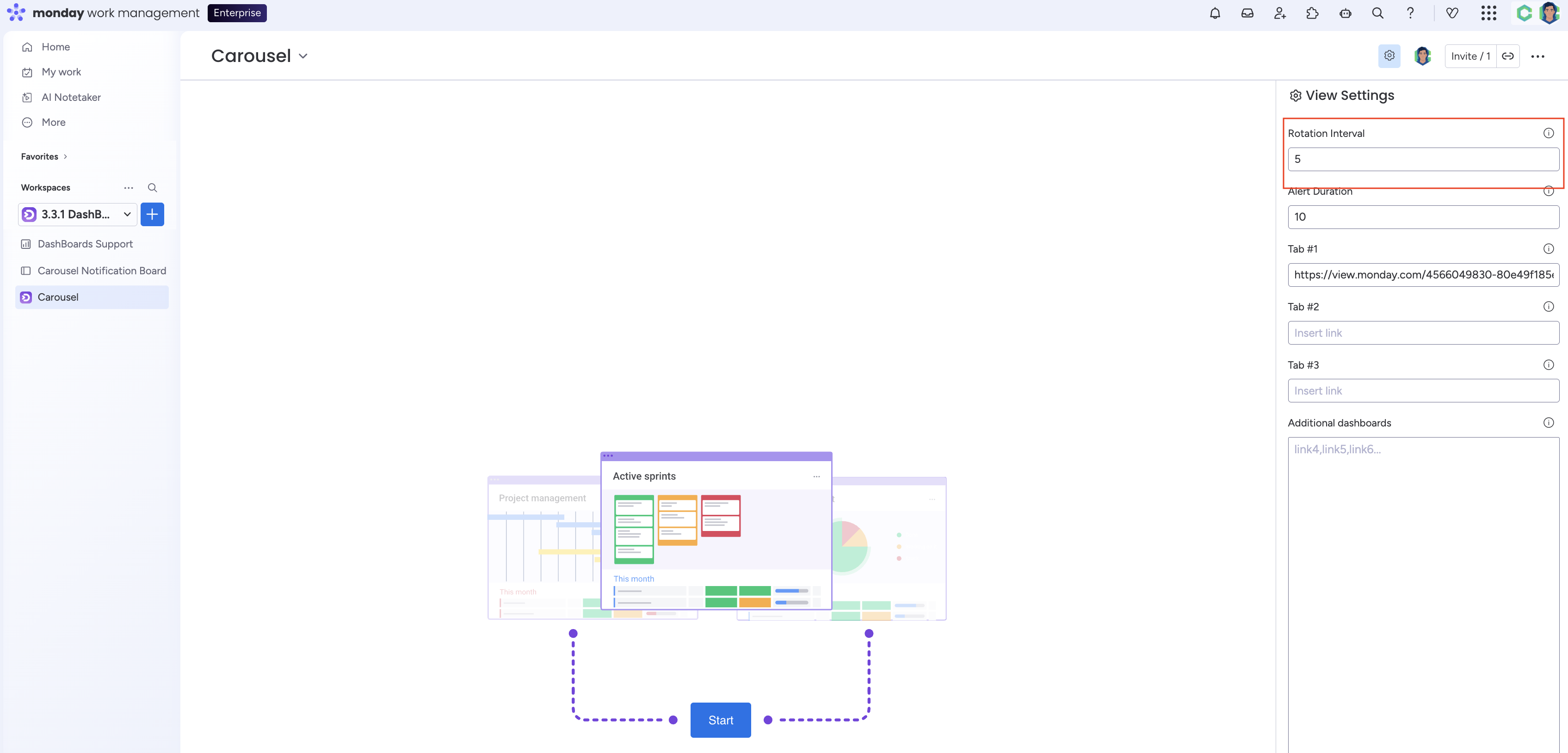 Close the settings page and click the "Start" button. Your Carousel will start to rotate between your boards.